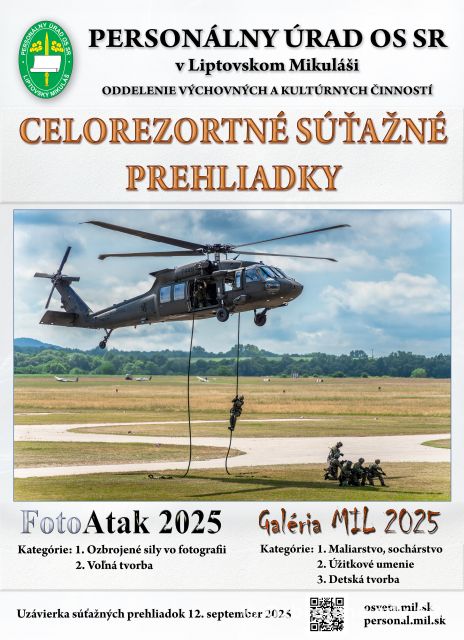 Personálny úrad OS SR v spolupráci s redakciou mesačníka Obrana vyhlasuje v roku 2025 celorezortné súťažné prehliadky pre profesionálnych vojakov, zamestnancov rezortu obrany, rodinných príslušníkov, ako aj vojenských dôchodcov a vojnových veteránov. Prvou súťažnou prehliadkou je FotoAtak a druhou Galéria MIL.