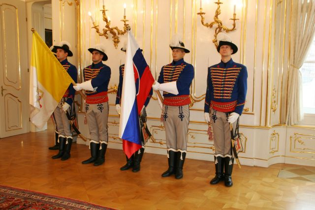 Slávnostný ceremoniál na zadnom nádvorí a v priestoroch Prezidentského paláca zabezpečili na vysokej profesionálnej úrovni príslušníci Čestnej stráže prezidenta Slovenskej republiky pod velením veliteľa útvaru plukovníka Miroslava Ištvána a povereného zástupcu veliteľa útvaru majora Jána Krajčoviča.